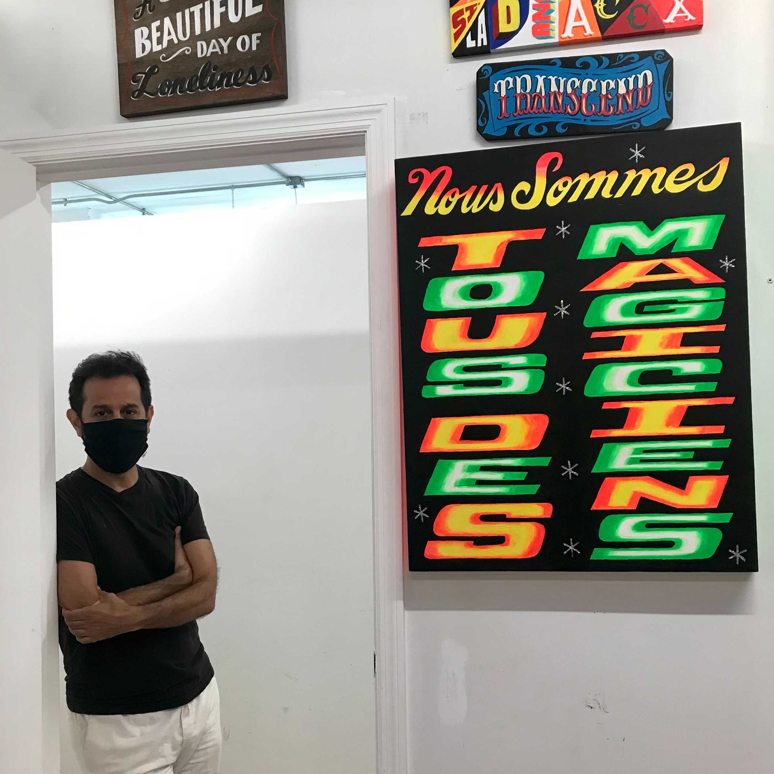 These bigger paintings came about after I was invited to exhibit my work at the Spectrum Art Fair in Art Basel. That was such a beautiful experience because you just see so much art. The experience inspired me a great deal. I came home filled with ideas and confidence to put time and energy to build a new, larger series of paintings. This also gave me the license to understand the impulse to deconstruct that I mentioned earlier. So these paintings are not necessarily as verbatim, but an amalgamation of so many different types of letterforms. I also started to develop a narrative of an alter-ego sign painter. I came up with this individual called Payaso, who is my alter ego. Sign painters usually sign their work and put their phone numbers on their work, so that's my phone number under the name.